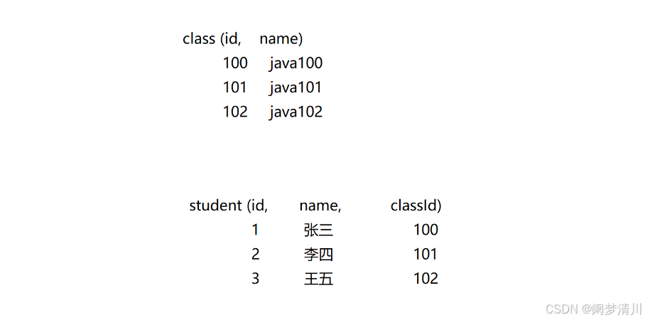 下面的这个是两张表:一个是我们的class班级表,一个是我们的student学生表,两个表里面都有学生班级的信息,只不过这个列名不一样,一个是使用的id表示的,一个是使用的classid表示的;