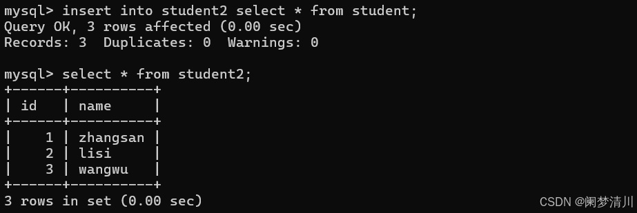 把这个查询的结果直接插入到我们的这个student2这个表里面去:这个实际上就是把两个步骤合成了一步,但是因为这个是查询结果的插入,所以就可以直接把两个语句合并了,查询发现这个是成功的;
