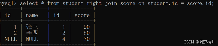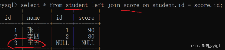 ==select * from student join score on student.id=score.id;==这个加上了join on这个选项,实际上输出的结果和上面的这个是一样的;