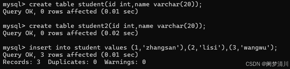 我们首先创建两张表,一个叫做student,一个叫做student2,两个表都是只有这个int和varchar 的数据类型,这个时候,我们向这个第一个表里面直接使用这个insert插入数据,但是这个时候student2这个表还是空的;