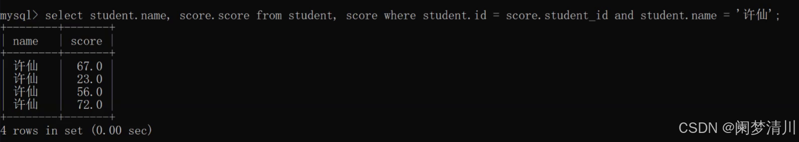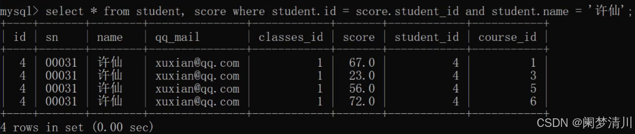 select * from student,score where student.id=score.student_id and student.name=‘许仙’;