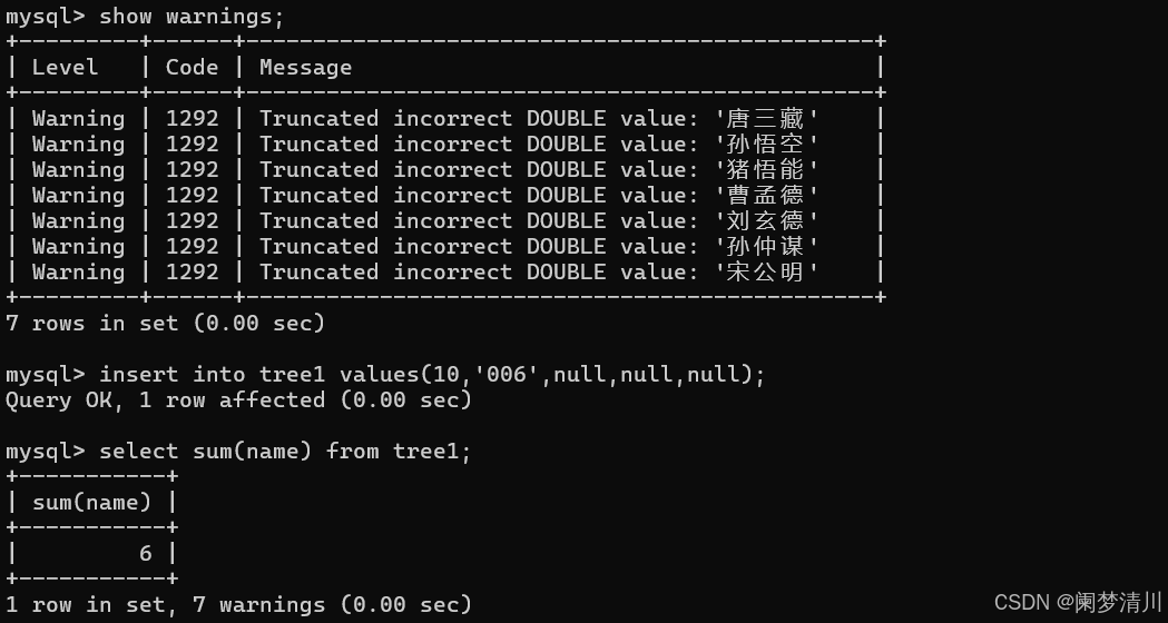 下面的这个就是插入了一行名字是006的数据,这个时候再次进行sum求和,就会发现这个时候的结果就是我们的6,因此这个就可以说明我们的这个006这样类似的这个name是可以被转换成功的,但是其他的这个“孙悟空”之类的这个不会被正确转换;