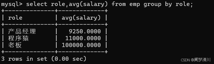 这个时候,我们计算一下这几个人的平均的薪资,使用的就是我们的这个avg聚合函数:但是这个是所有人的平均薪资,这个显然是不可以客观反应我们的实际情况的,因此我们需要按照这个置为分别去求解这个对应岗位的平均薪资,这个就是我们的group by分组查询;