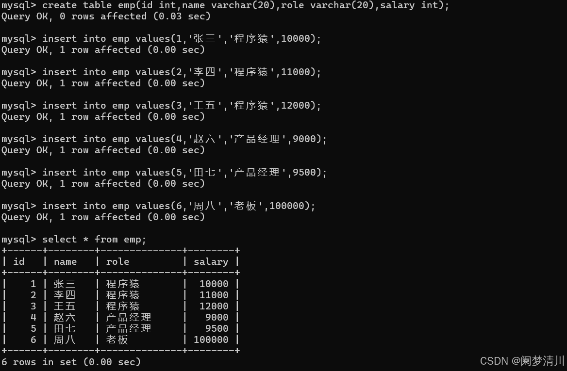 我们的操作还是基于这个表来完成的,因此我们首要的任务就是创建一张表:我下面的这个是一个简单的和这个公司的业务类型以及这个薪资,姓名制作的一张表;