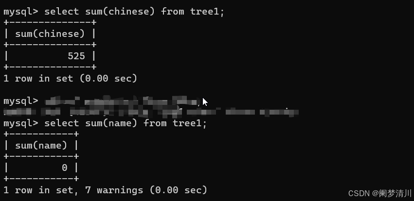 下面的这个是使用的sum函数进行这个统计的,)因为这个里面的这个语句写的有问题,中间出现了小状况,因此这个打上了马赛克),我们使用这个sum的时候,如果这个里面的参数是我们的这个具体的学科的时候,因为这个分数是double类型的数据,这个是可以进行相加操作的,但是如果我们对于这个name进行求和的操作,这个时候输出的结果是0,而且会有警告;
