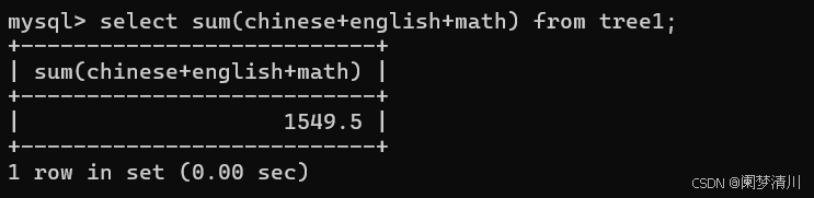 此外,这个sum里面可以添加一些这个表达式之类的,像下面的这个就是在我们的这个sum里面添加了一个表达式,表达的就是三门学科的平均成绩,这个时候我们的这个sql语句执行的时候,就会首先去执行这个求和的过程(chinese+math+english),然后再去把每一个人的这个分数进行sum操作,这其实就是两个步骤,使用一个sql语句进行表达罢了;