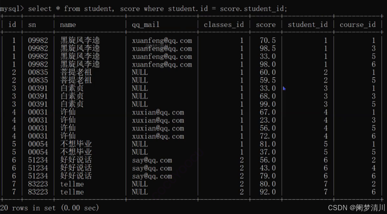 select * from student,score where id = student_id;