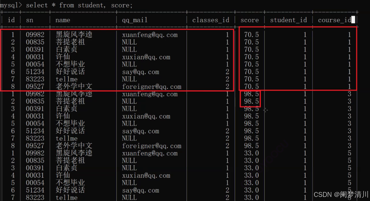 select * from student,score;(这个顺序决定了哪个表在左边,哪个表在右边)