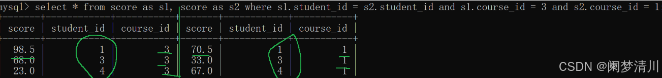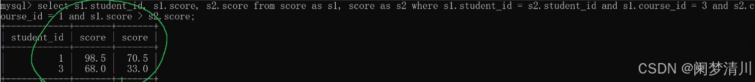 select s1.student_id,s1.score,s2.score from score as s1,score as s2 where s1.student_id = s2.student_id and s1.score > s2.score;—选出来有用信息的列;