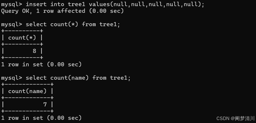 但是如果哦我们的这个表里面有些数据是空的,这个时候我们再次使用这个select进行这个count计数的时候,这个null也是会被算上的,我们可以insert进去一行全部都是空的数据尝试一下,但是我们使用这个name进行统计的时候,这个null就不会被统计进去;