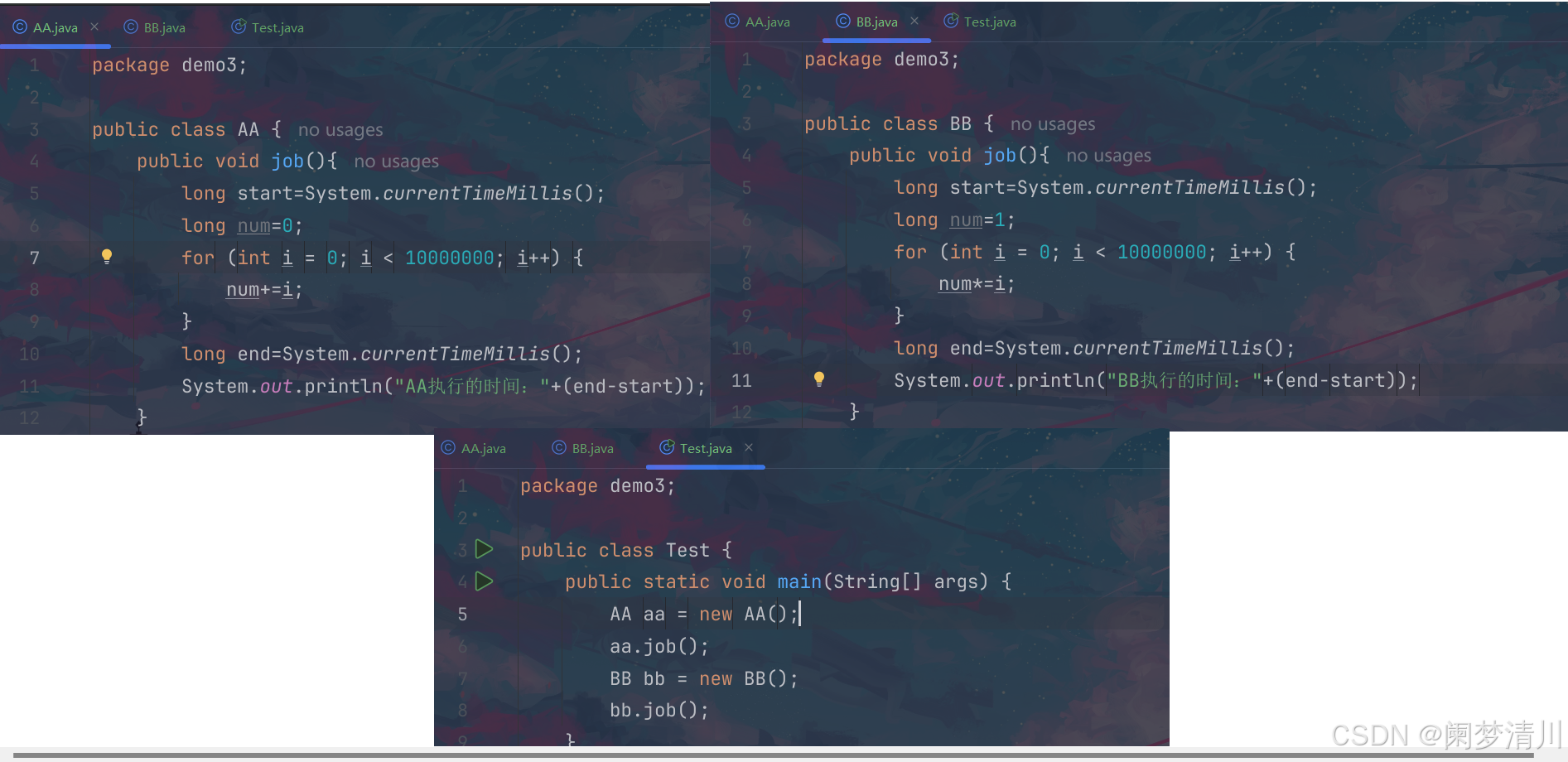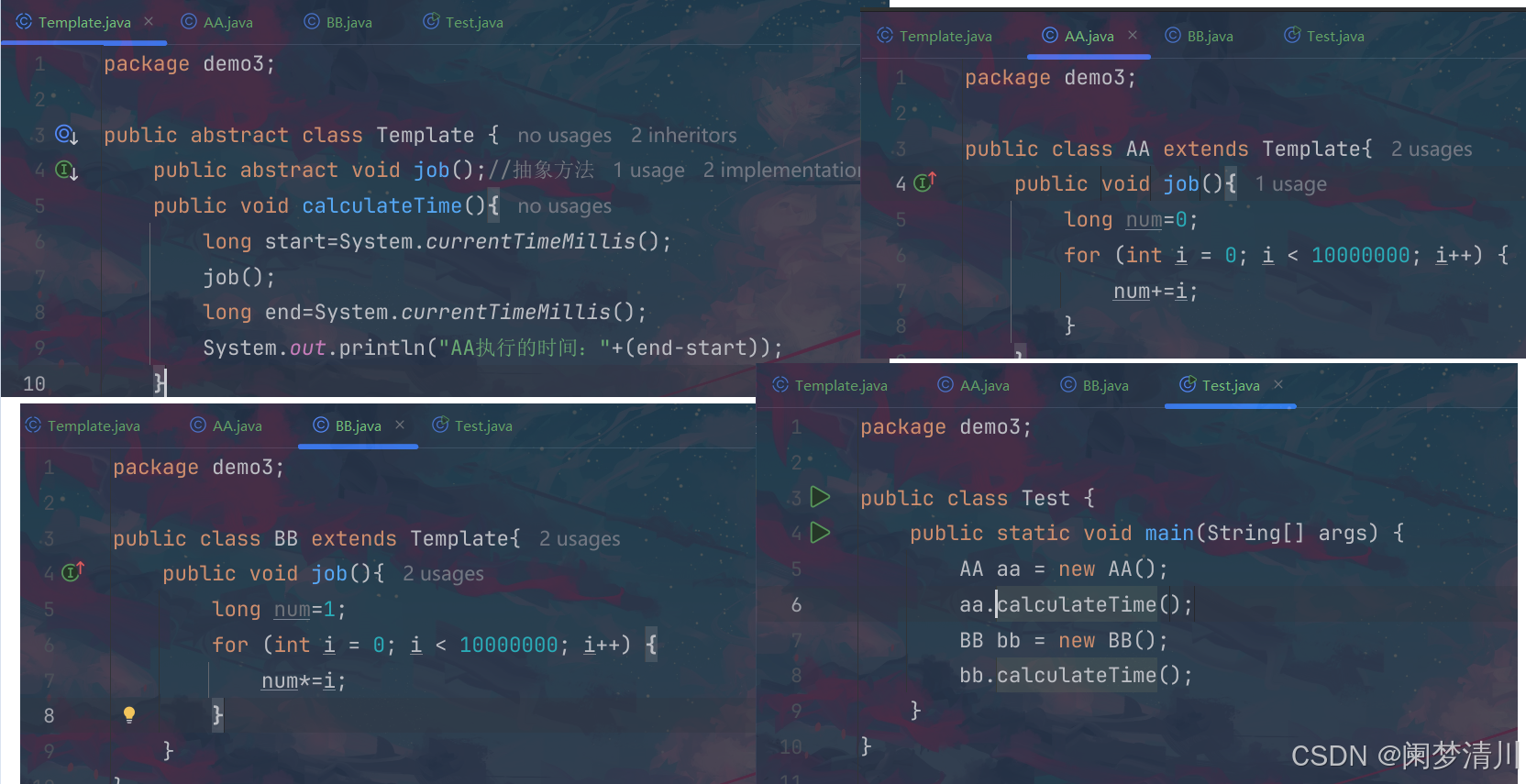 下面的这个就是我们把计算这个开始时间和结束时间,以及这个时间差的内容封装成为一个抽象类,在这个类里面实现这个计算时间的calculatetime方法,但是不实现这个job方法,而是把这个job方法定义为一个抽象的方法,这样无论是我们的这个AA还是BB,都会去对于这个方法进行重写,这样的就是充分利用了我们的抽象类的特性,如果我们的这个aa调用calculate方法,就动态绑定到我们的这个AA类里面的这个计算,这个就实现了我们的多态的效果以及抽象类的使用;