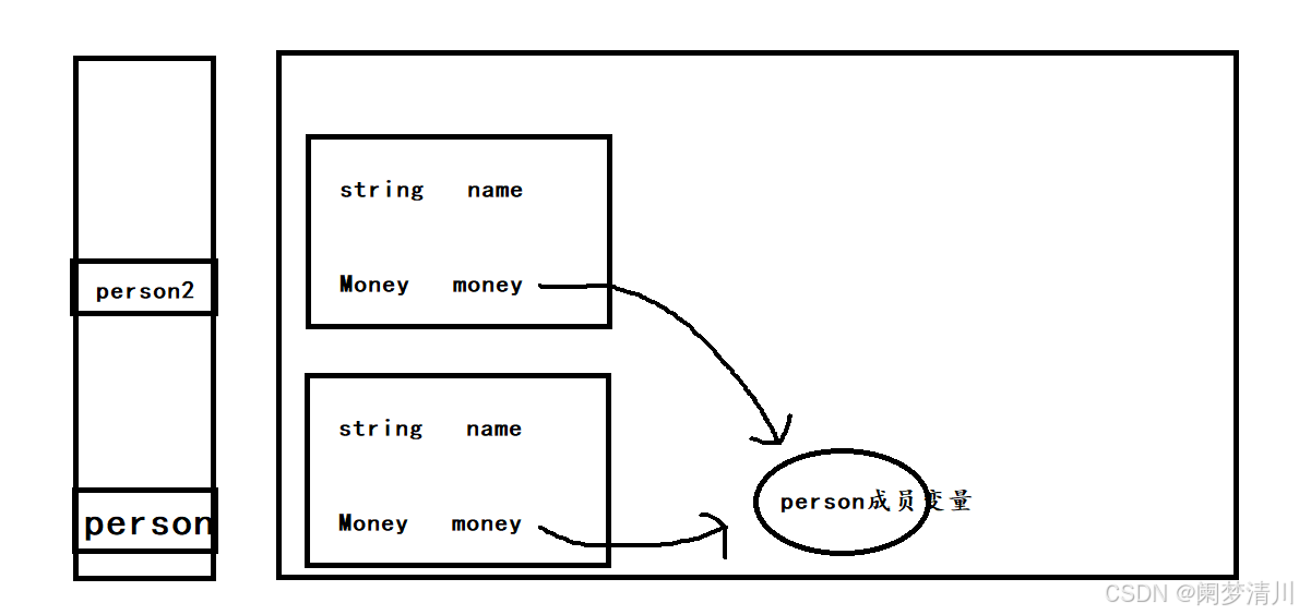 浅拷贝就是直接把这个person1对象的这个内容拷贝给了这个person2对象,这个时候,对于这个money引用(这个里面的成员变量和对象都是叫做money,不要误会了)我们的这个money对象就是一个引用,指向的就是我们的这个money成员变量(person类里面的这个成员变量,图示有问题,应该是money成员变量,但是这个是属于peron类里面的这个person1对象的);