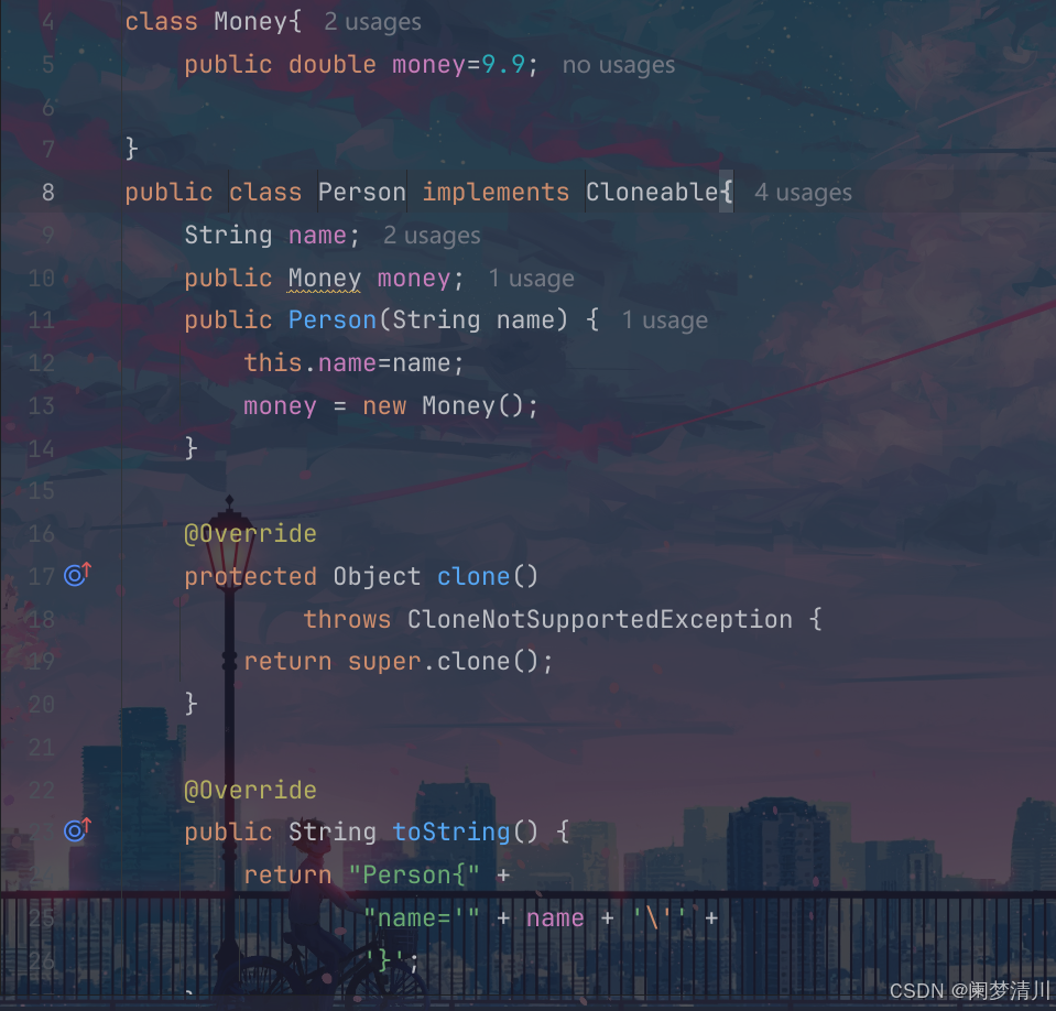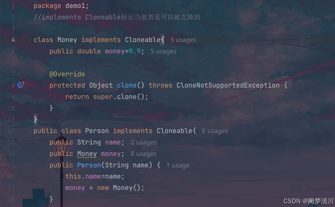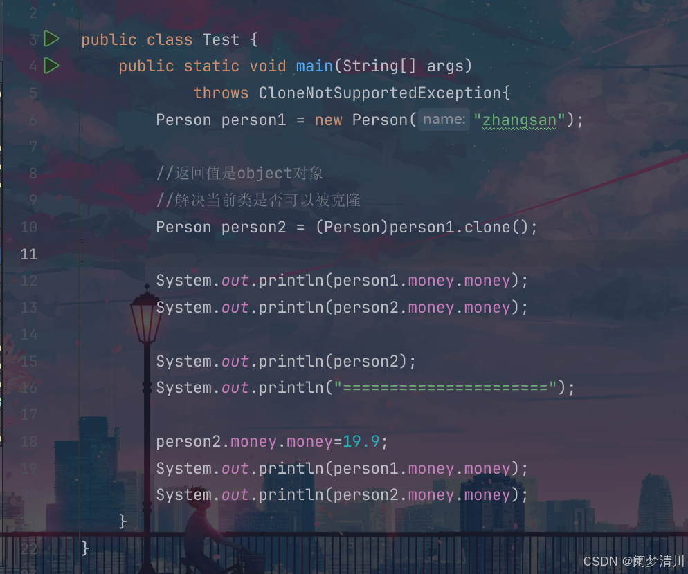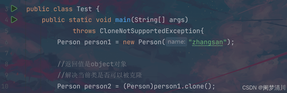 在我们的这个person类里面,需要对于这个克隆的方法进行重写的操作,这个throws就是抛出异常,implements clonable表示这个接口是可以被克隆的,clone方法的这个返回值是这个object类型的,因此这个test里面,我们对于这个返回的对象进行强制类型转换;