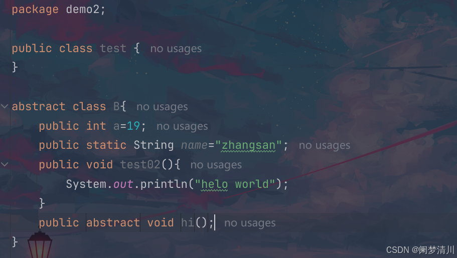 5)抽象类可以没有抽象方法,像上面的这个抽象类A里面没有抽象方法也是可以的;而且这个抽象类可以有自己实现的方法; 6)一个类有抽象的方法,这个类一定是抽象类,但是没有抽象方法,也可以是抽象类; 7)abstract只能修饰这个类和方法,但是不可以修饰属性(例如这个anstract int a=10这样是不被允许的); 8)抽象类也是类,除了这个里面的抽象方法是不可以实现的,其他的和这个普通类没有区别,就是普通的类有的我们也可以有:像下面的这个抽象类里面的这个成员变量,静态变量,普通的方法,我们都是可以有的;