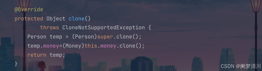 我们的做法就是重写这个clone方法,这个时候,我们定义一个对象temp接受这个clone的返回值,我们想要克隆的是这个person1对象里面的这个money引用指向的这个成员变量,this就是我们的这个被克隆的对象,具体到这个问题里面就是person1,也就是把这个person1对象的money引用clone到我们的这个temp里面去,这个实际上就是把这个引用对象里面的这个成员变量money给了这个temp(这个时候因为我们的这个上面的money类也需要对于这个里面的方法重写我们的clone方法,并且抛出异常),然后我们的这个tem作为返回值,这个时候,我们的这个person2接受的对象就是temp,这个时候的temp的成员变量就给了我们的person2,这个时候person1和person2对象里面的这个money引用里面对应的成员变量的数值就会不一样,地址也是不一样,实现各自对于成员变量的控制,这个就是深拷贝的过程;