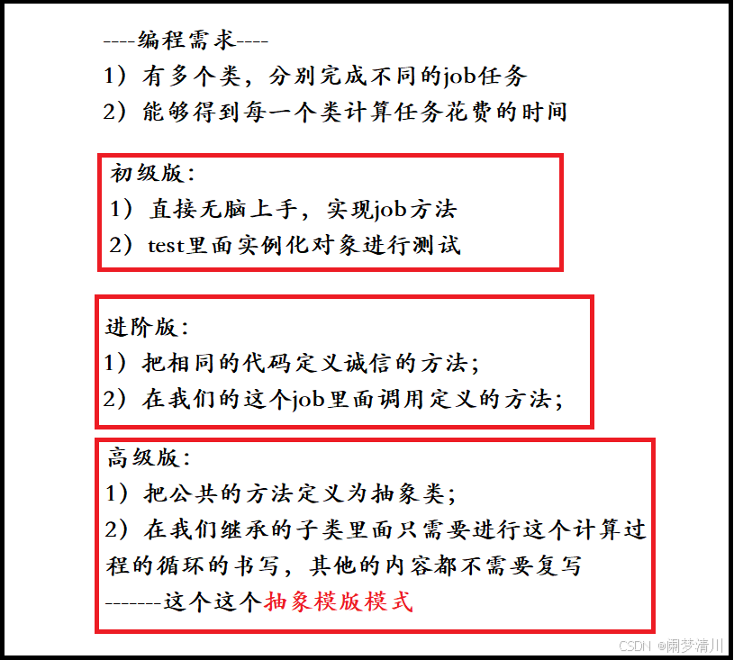 其实这个抽象模版模式:就是为了体现我们上面学习的这个抽象类的价值,通过这个案例,我们逐渐从传统的类和对象过渡到我们的抽象类的写法;