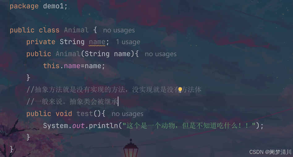 下面的这个就是我们在一个包里面定义的一个类Animal,这个类里面有一个成员变量和成员方法,还有一个构造方法,在这个成员方法里面,我们就是简单的实现了一个eat方法,但是动物的种类有很多,我们其实并不知道这个动物具体会吃什么,因此我们的这个打印其实是没有任何的实际意义的;