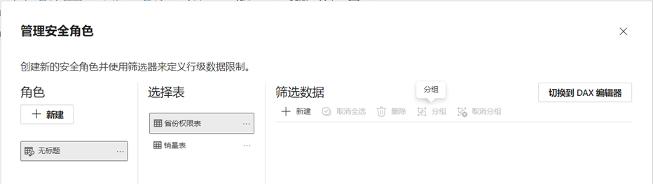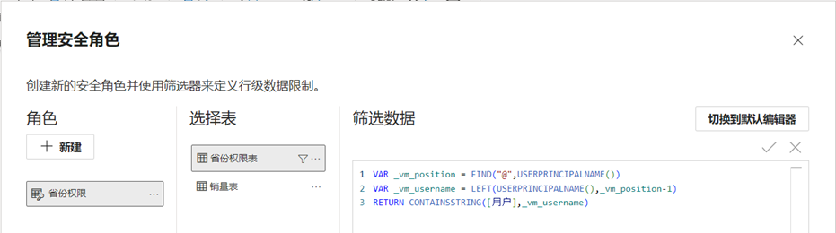 STEP 1 点击菜单栏建模下的管理角色;在跳出的窗口中,点击新建角色,为角色命名;点击右上角的切换到DAX编辑器,切换到筛选表达式的代码界面。