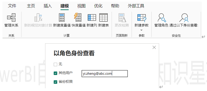 STEP 3 调试。点击菜单栏建模下的通过以下身份查看,在跳出的窗口中,同时选择省份权限和其他用户,输入用户邮箱。