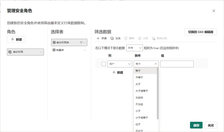 在建模的管理角色中使用默认编辑器向导设置行级别权限,只能对字段做简单筛选,如何使用包含判断和调用登录用户名实现动态权限呢?