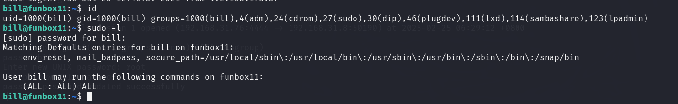bill用户倒是正常的,而且是可以直接提权的。但是我们又不知道bill用户的密码。