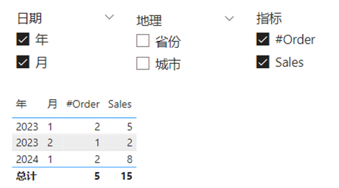 用字段参数在画布中仿造了一个透视表,让用户按自定义需求返回数据。美中不足的是,每个切片器至少要选择一个值才行,切片器全不选的时候,反而是全选的意思,所有字段都会出现在表中。如果有多个维度字段,这个透视表就不完美了。下图的地理字段切片器什么也不选的时候,表内把省份和城市两个字段都显示出来了。