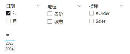 保留日期切片器的一个字段,其余两个切片器全不选,如下: