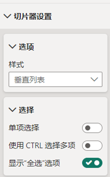 STEP 1 选中切片器,在格式窗格的切片器设置中,把使用Ctrl选择多项关闭,把显示全选选项打开。