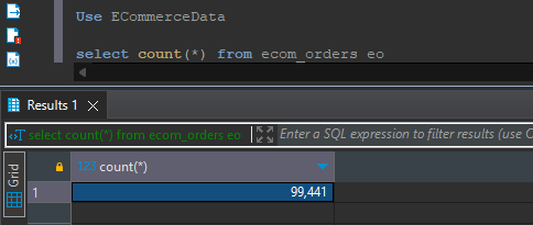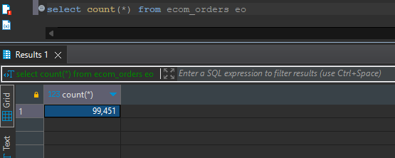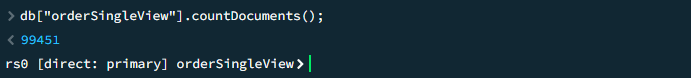 - 运行以下查询检查 MongoDB 中订单的总数。总数现在应为 99,451,因为我们通过脚本新增了 10 条记录。在通过脚本新增记录之前,总数为 99,441。