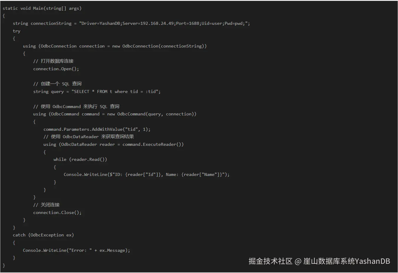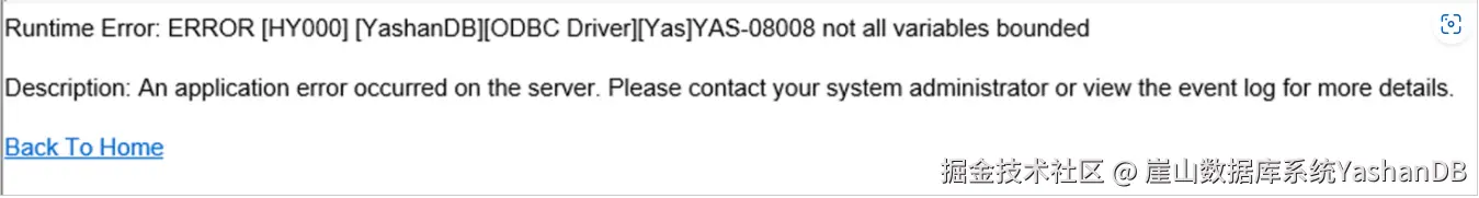 上面的c#代码在执行时会在控制台打印异常:Error: ERROR [HY000] [YashanDB][ODBC Driver][Yas]YAS-08008 not all variables bounded