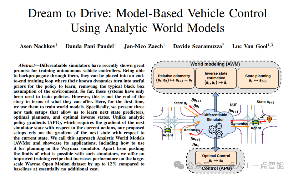 本文提出了一种基于可微分仿真器的自动驾驶车辆控制方法,首次将可微分仿真应用于世界模型(World Model)的训练。通过引入解析世界模型(Analytic World Models, AWMs),作者设计了三种新任务——相对里程计预测、最优状态规划和逆最优状态估计,旨在解决传统基于策略的模型(如APG)在规划能力与可解释性上的不足。