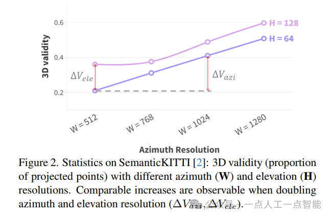 传统投影方法通过提高方位角分辨率(图像宽度W)以缓解“多对一”问题,但导致计算资源浪费(如空像素过多)和模型复杂度增加。作者通过实验发现,同时优化方位角与仰角(elevation)分辨率(即图像高度H)能更有效提升投影率(图2),但直接提高分辨率不可行。