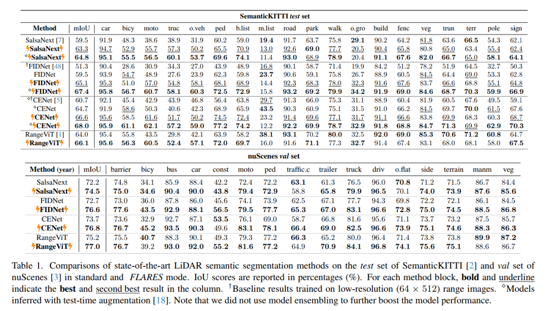 首先,在标准模式下,作者将分辨率设置为64×512和32×480,将整个点云分成多个子云进行训练和推理。然后,他们比较了使用FLARES方法的四种网络结构(SalsaNext、FIDNet、CENet和RangeViT)与基线模型之间的性能差异。结果表明,这四个网络都获得了显著的提高,其中SalsaNext提高了5.3%,FIDNet提高了7.9%,CENet提高了3.3%,而RangeViT也取得了巨大的改进。此外,FLARES方法还可以改善小、动态和稀有的类别的分割精度。