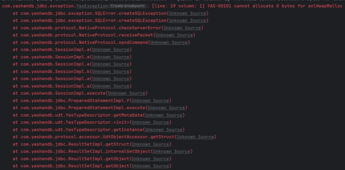 某客户的业务在通过 YashanDB jdbc 驱动查询含有 st_geometry 列的数据时,报如下异常:YAS-00101 cannot allocate 0 bytes for anlHeapMalloc