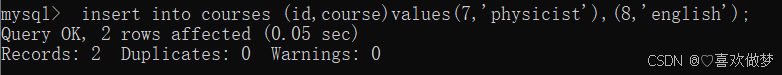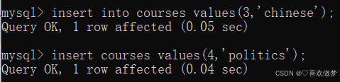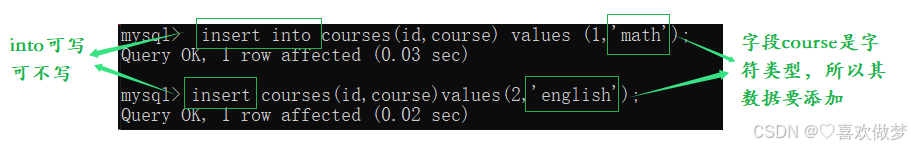 insert [into] 表名 [字段1,字段2] values(值1,值2)[,(值1,值2),(值1,值2)];
