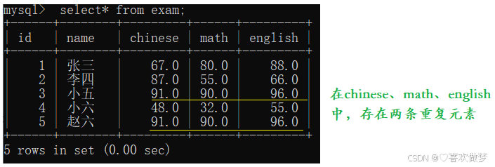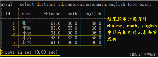 如果我们要同时加上id,name并且对chinese、math、english中的元素进行去重,看一下是否可以成功?