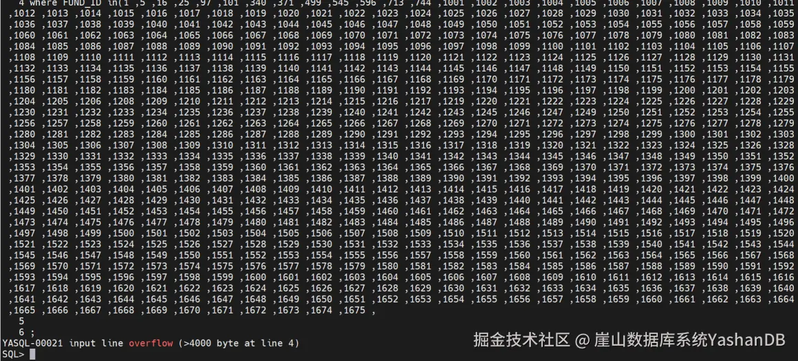 在yasql执行sql语句后报错:YASQL-00021 input line overflow (>4000 byte at line 4)