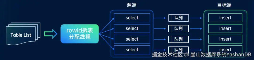 其次对大表进行拆分,均匀拆分成多个子表,分配给多个线程,进一步提高并发度。迁移组件采用rowid拆表算法,拆分耗时短,可以支持无主键表的拆分。