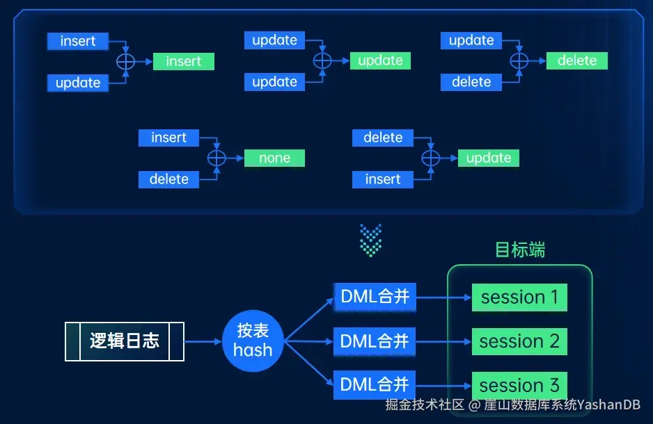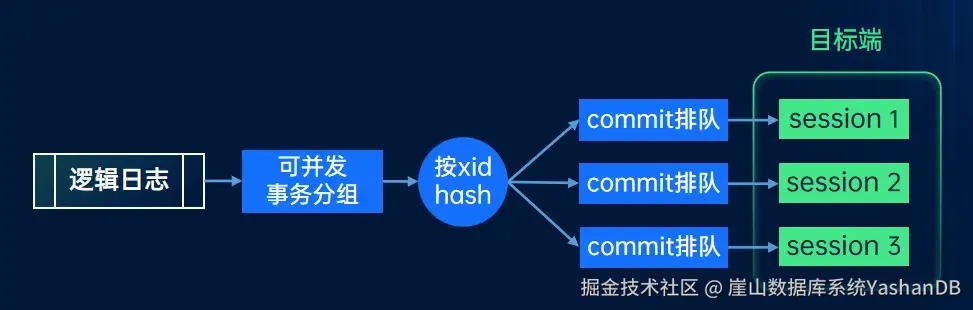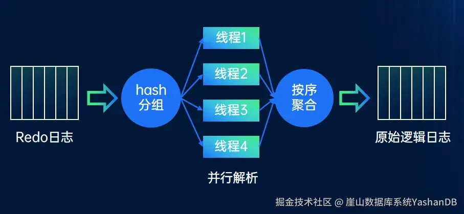 单个解析线程的性能无法满足并发业务产生的数据库Redo解析要求,因此YStream将Redo日志进行哈希分组,然后分配给多个线程进行独立解析。解析完毕后,再按照原始顺序进行聚合,生成原始逻辑日志进行事务组装和发送。