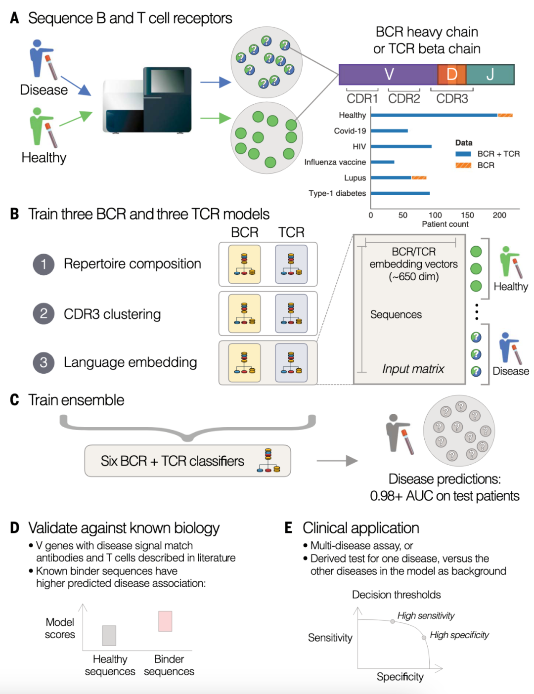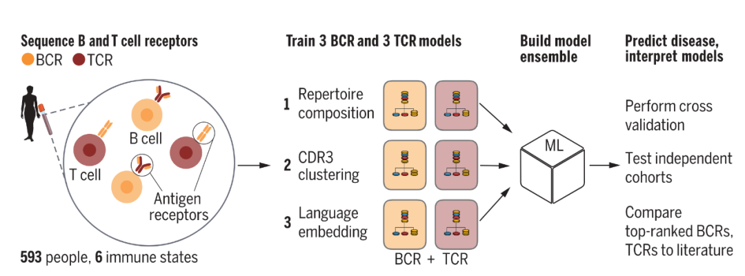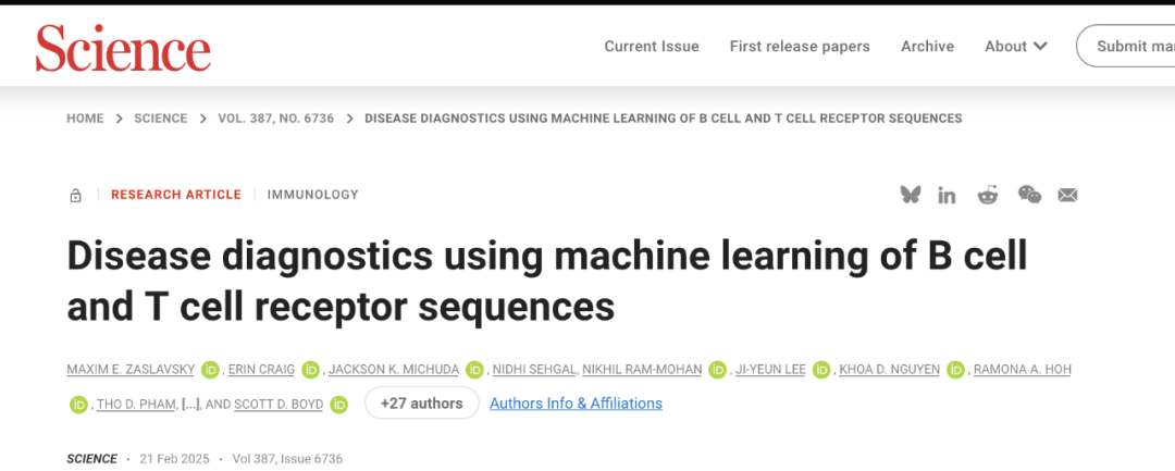 Zaslavsky, M.E., Craig, E., Michuda, J.K., Sehgal, N., Ram-Mohan, N., Lee, J.Y., Nguyen, K.D., Hoh, R.A., Pham, T.D., Röltgen, K. and Lam, B., 2025. Disease diagnostics using machine learning of B cell and T cell receptor sequences. Science, 387(6736), p.eadp2407. 本文为实验盒作者对论文的学术分析、阐释及个人观点的呈现。原论文的版权归属于原作者,并遵循其版权协议。本文的解读内容由实验盒作者独立撰写,未经许可,请勿转载,侵权必究。如需转载,请提前通过私信联系。