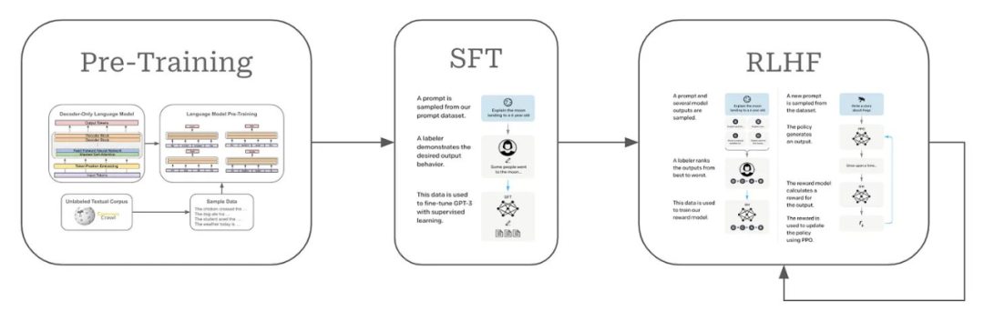 首先,在来自互联网的原始文本数据上预训练语言模型。之后,对齐这些模型,也就是让它们的输出更符合人类的偏好,这会用到监督微调(SFT)和基于人类反馈的强化学习(RLHF)等技术。