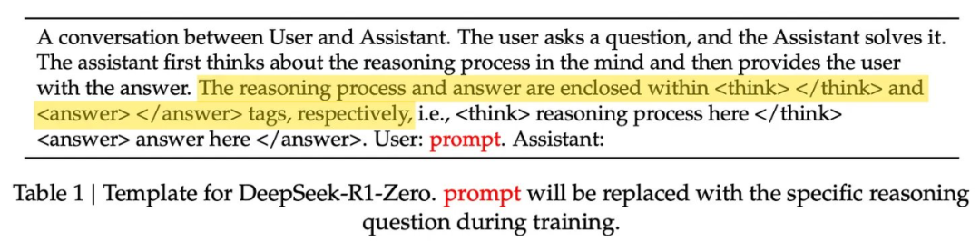 如前所述,当模型的输出格式正确时,格式奖励会提供积极的训练信号。[1] 中使用的格式只是将模型的长思维链(或思考 / 推理过程)放在两个特殊 token 之间:<think> 和 </think>。然后,在推理过程完成后,模型会在 <answer> 和 </answer> 标签之间单独生成答案;如下所示。