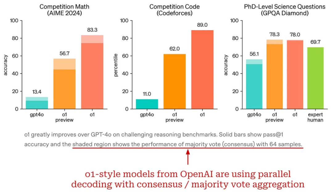 这些方法的主要好处是简单又有效。并行解码很容易扩展:我们只需生成、验证和聚合大量输出,就能得到有意义的性能提升 [9, 10, 11]。o1 式模型显然使用了并行解码技术 —— 只需查看其博客中提供的图表细节(如下所示)!但是,并行解码技术本身无法解释最近发布的推理模型所表现出的一些更复杂的推理行为。