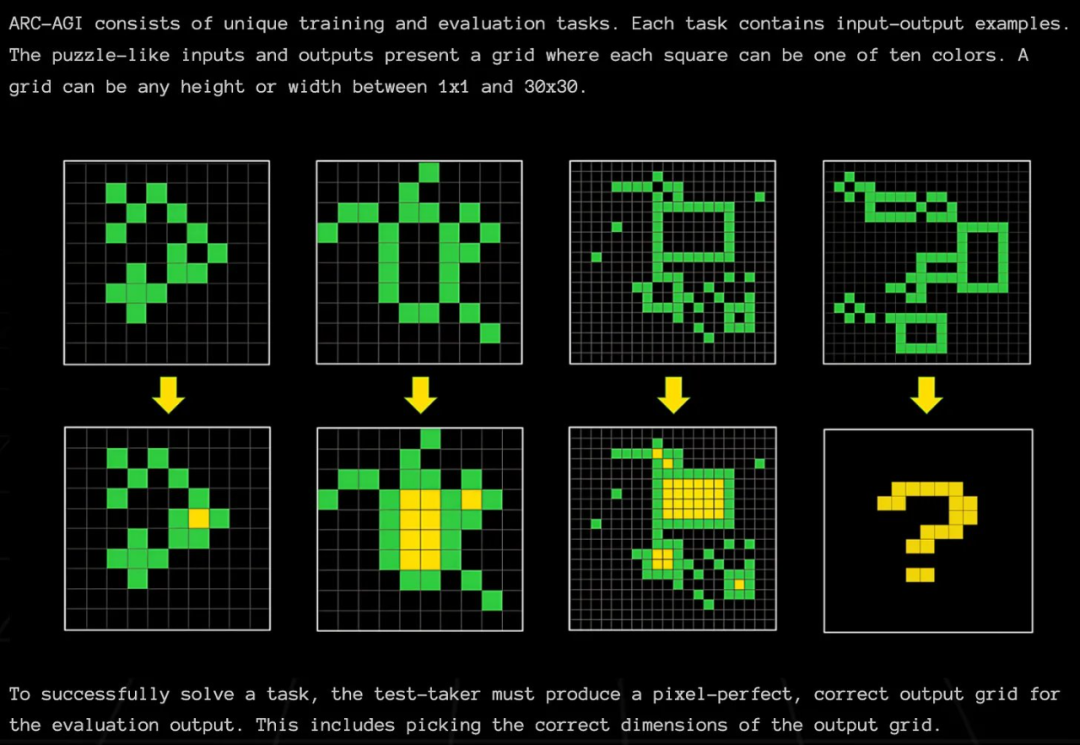 ARC-AGI 基准 —— 被描述为「迈向 AGI 的重要垫脚石」—— 涉及各种基于网格的谜题,其中 LLM 必须在输入输出网格中学习模式,并在最终输出示例中完美复制这种学习到的模式。大多数 LLM 都很难解决这些难题(例如,GPT-4o 的准确率仅为 5%),但推理模型在这个基准上表现相当不错 —— 准确率可达 30-90%,具体取决于计算预算。