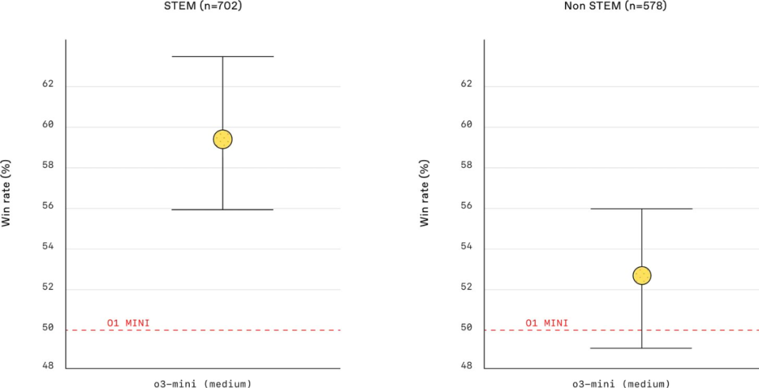 o3-mini 与 o1-mini 在 STEM / 非 STEM 提示词上的胜率(来自 [6])