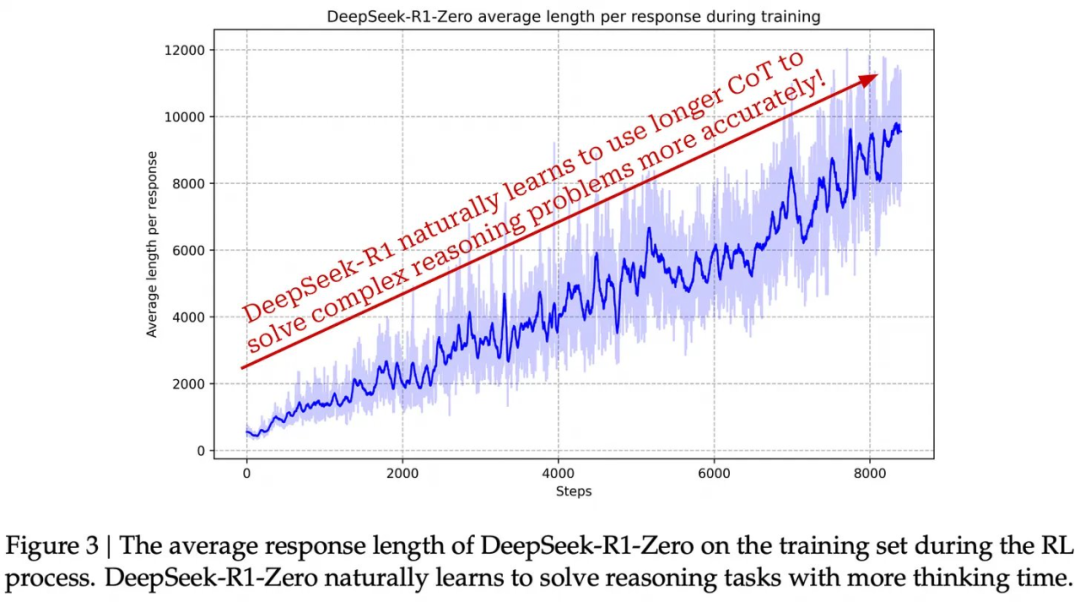 发生了什么?显然,DeepSeek-R1-Zero 从 [1] 中介绍的强化学习训练过程中获得了出色的推理能力。然而,模型学习过程的动态也相当明显!因为没有进行 SFT 式训练,所以可以在整个强化学习训练过程中密切监控模型推理策略的进展。如下所示,DeepSeek-R1-Zero 学会了利用更多的「思考时间」,即生成越来越长的思维链,从而可以随着训练的进行改进其推理过程。该模型自然学会了利用更多的测试时间计算来解决更难的问题!