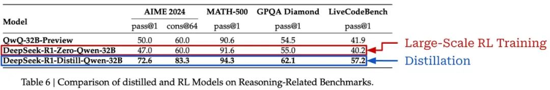 有趣的是,[1] 中提到,使用上述蒸馏方法基于 R1 蒸馏 Qwen2.5-32B 基础模型比通过大规模强化学习直接训练该模型表现更好,如下所示。