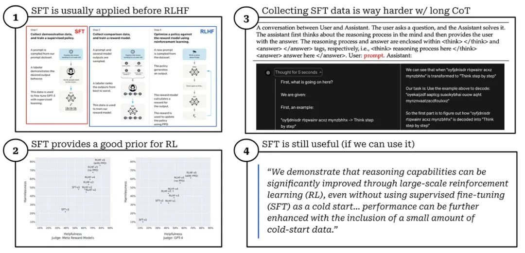 SFT 是必要的吗?R1-Zero 展现了在没有 SFT 的情况下训练出强大推理模型的能力,而完整的 R1 模型使用多个 SFT 阶段来获得更强大的最终模型。因此,我们可能会开始怀疑:我们是否应该使用 SFT?