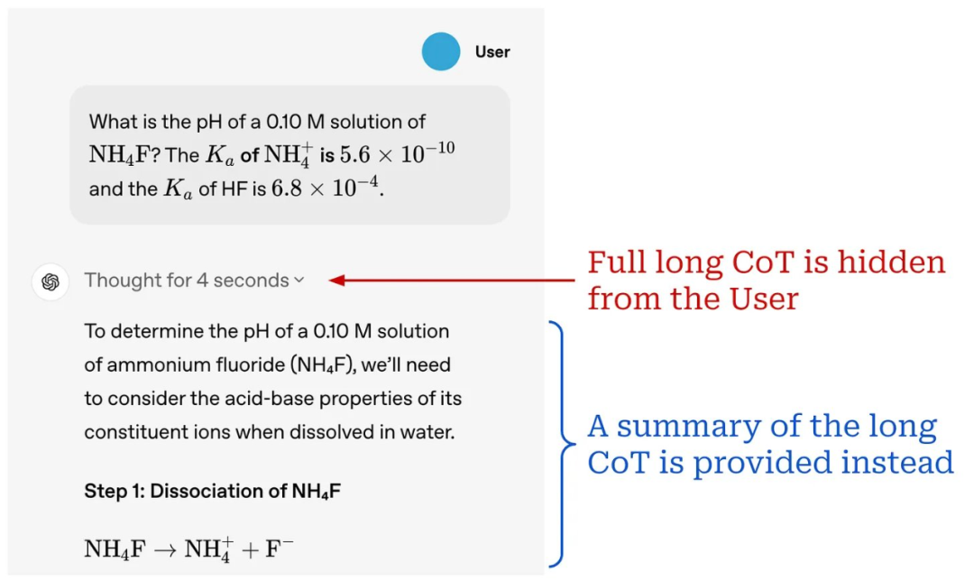 值得注意的是,OpenAI 推理模型使用的长思维链隐藏在其内部,这意味着在与模型交互时,用户看不见它们。用户只能看到模型编写的长思维链摘要,如下所示: