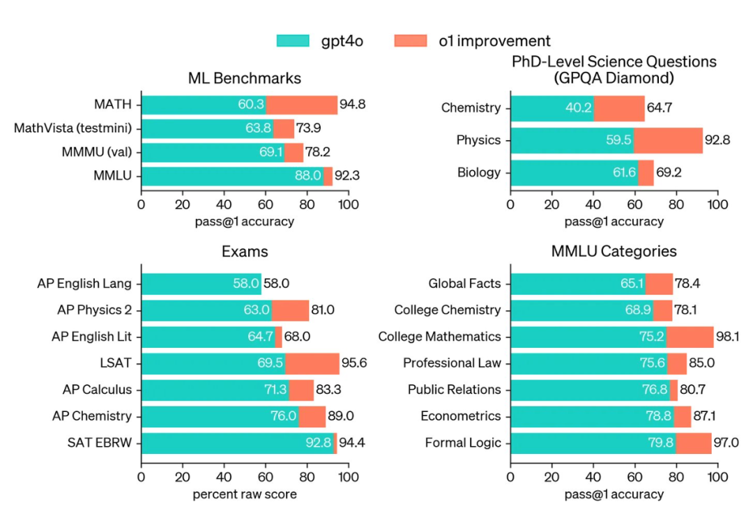 o1 系列模型与 GPT-4o 在多个推理任务上的比较,来自 [5]